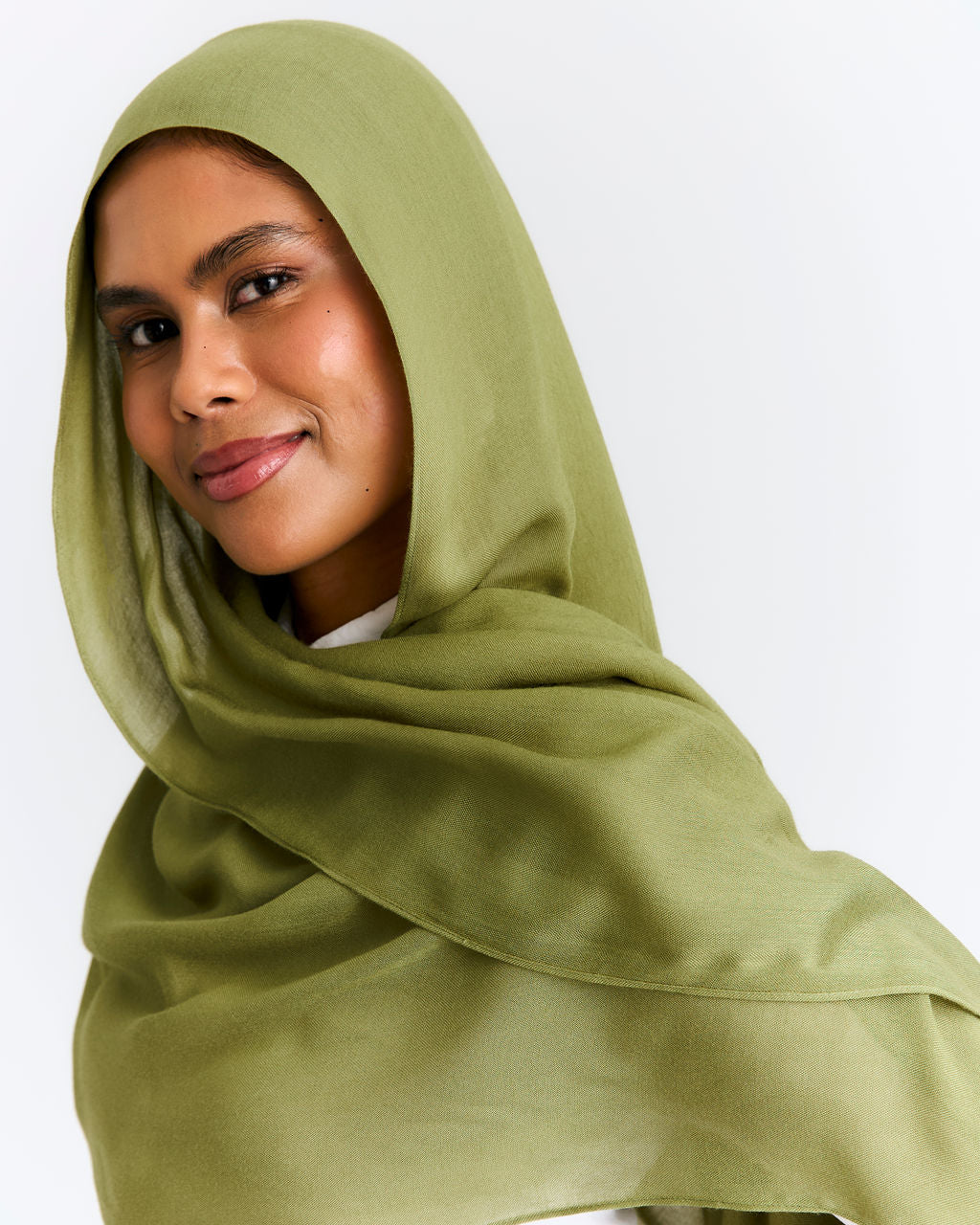 This muted green modal hijab has warm olive undertones. Earthy, mellow, and just a little cheeky. Part of the Qahwah Cafe series. It’s buttery soft, drapes beautifully, and lays perfectly on your head. Made from Anar’s Butter Modal fabric.