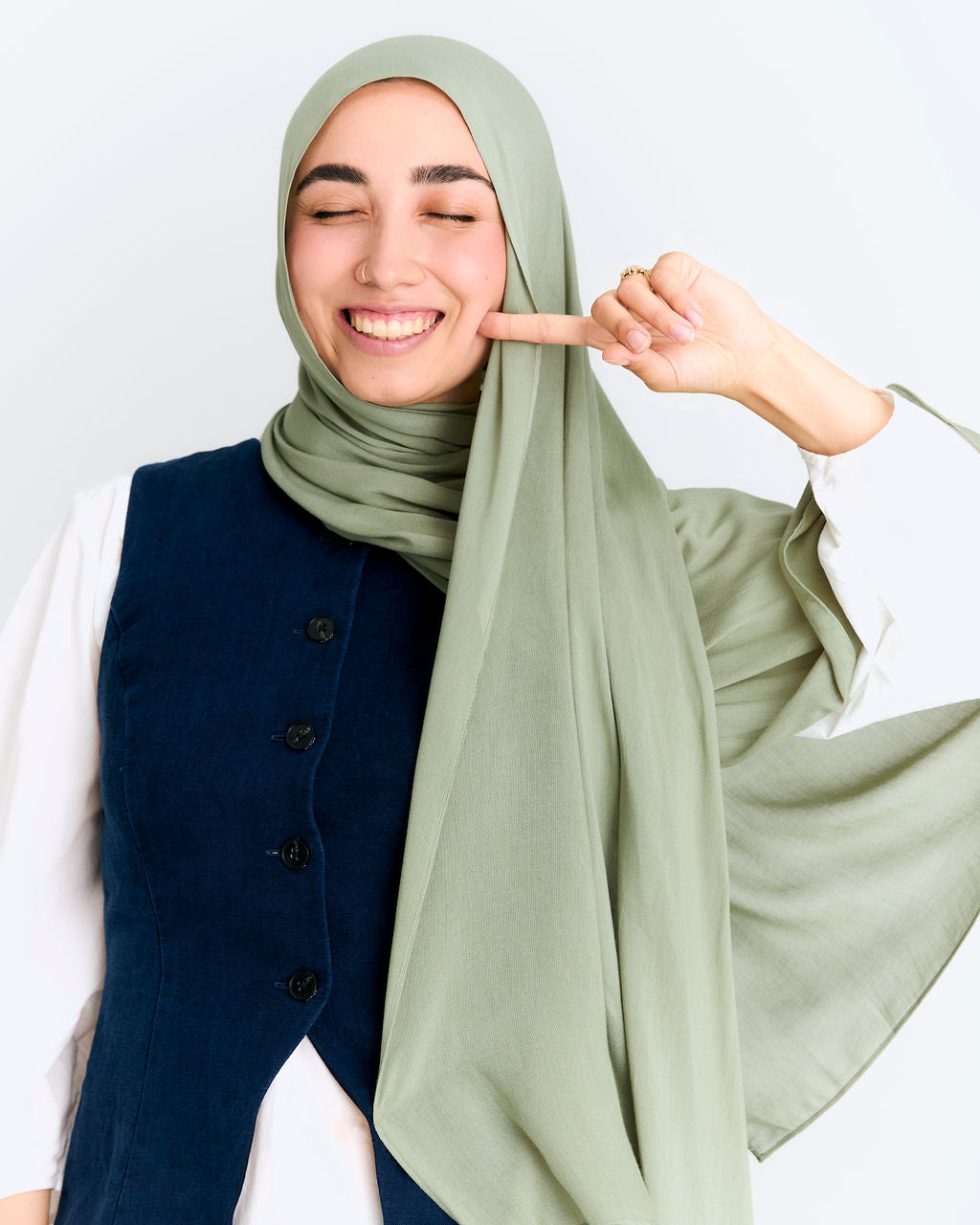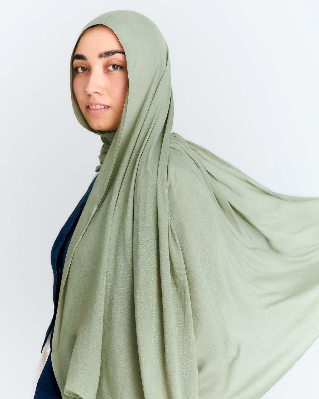This soft sage green modal hijab has warm yellow undertones. Calm, earthy, and steeped in simplicity. Part of the Qahwah Cafe series. It’s buttery soft, drapes beautifully, and lays perfectly on your head. Made from Anar’s Butter Modal fabric.