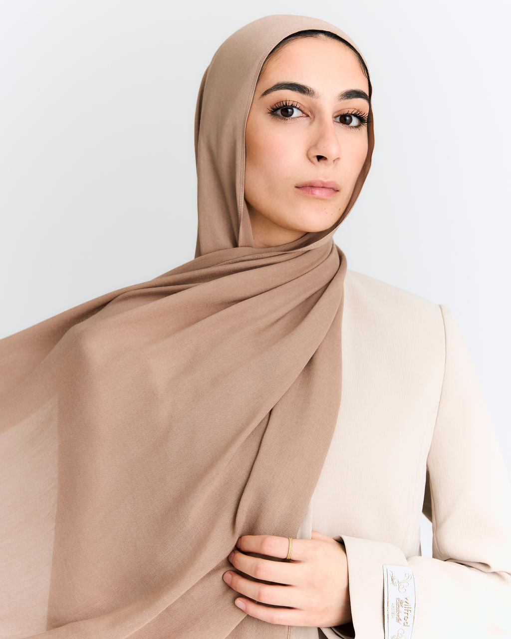 This soft coffee brown modal hijab has warm taupe undertones. Mellow, grounded, and brewed just right. Part of the Qahwah Cafe series. It’s buttery soft, drapes beautifully, and lays perfectly on your head. Made from Anar’s Butter Modal fabric.